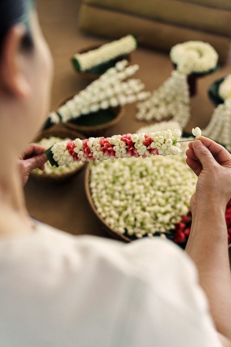 Songkran im Chiva-Som Hua Hin ist geprägt von Authentizität und Respekt vor der thailändischen Kultur. Kreative Workshops wie das Flechten von Blumenkränzen oder das Falten von Lotusblüten laden zu Momenten der Ruhe und Achtsamkeit ein.
